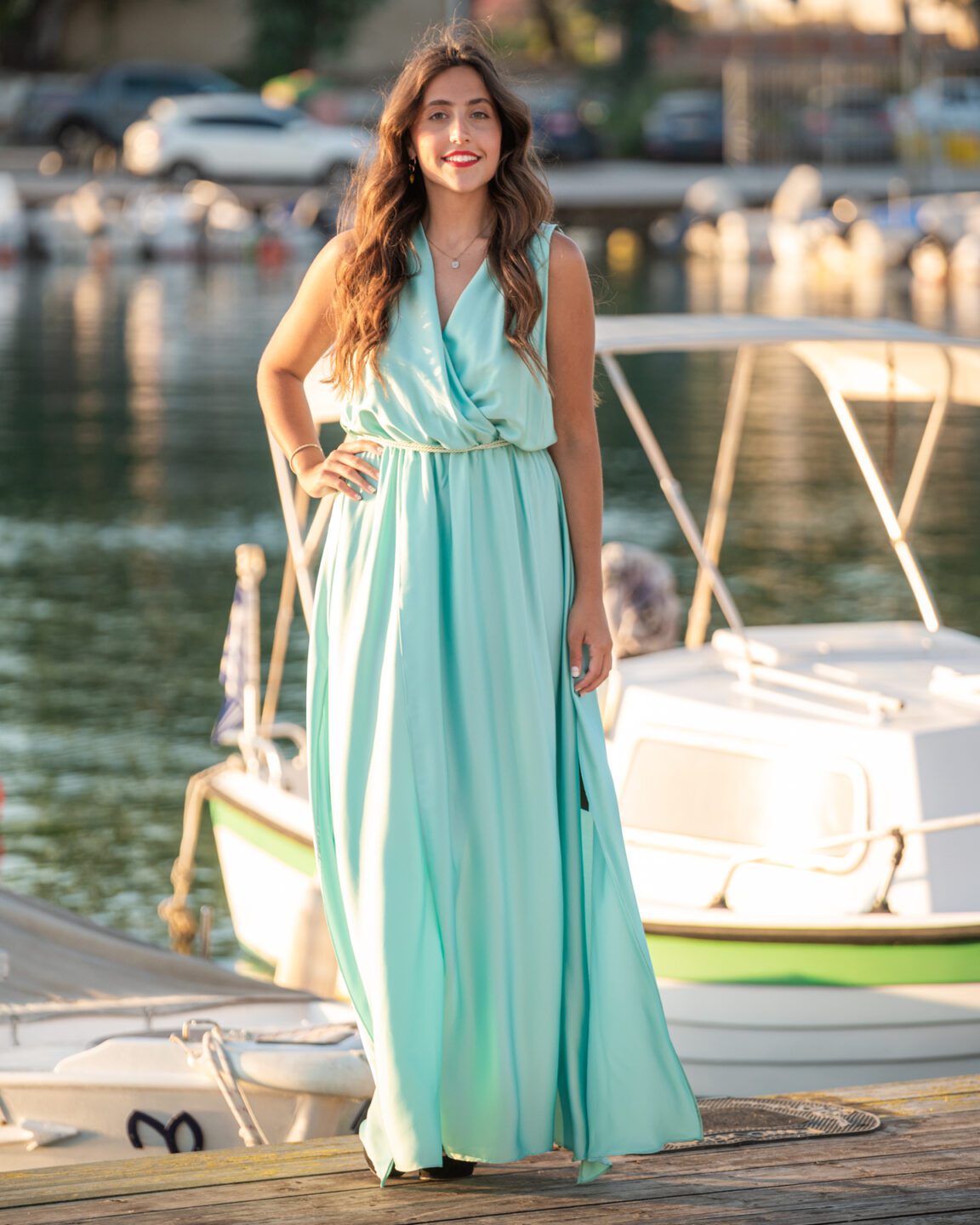 Maxi αέρινο φόρεμα με μπούστο κρουαζέ σε βεραμάν. Πλούσια φούστα με σκίσιμο και ψιλόμεσο ζωνάκι. Ελληνικής ραφής