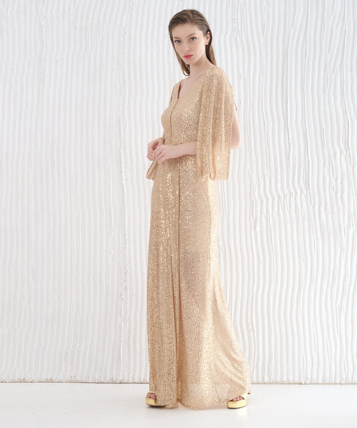 Mάκρυ φόρεμα από παγιέτα και πάνελ μανίκια. Άνοιγμα εμπρός στο κάτω μέρος της φούστας. Κουμπώνει με φερμουάρ πίσω και είναι φοδραρισμένο.
