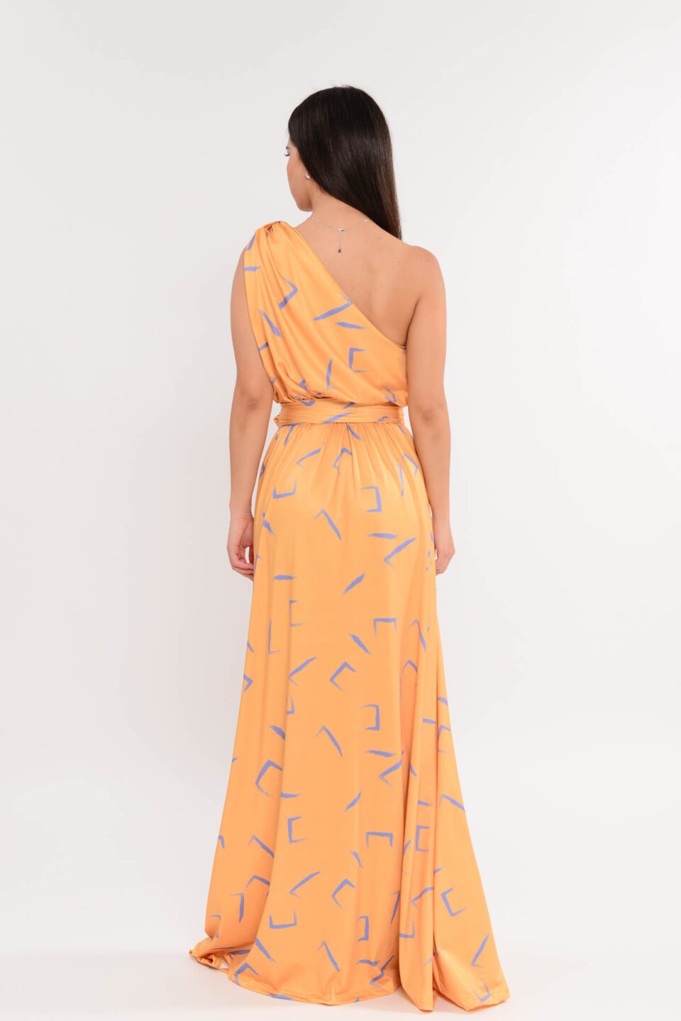 Maxi φόρεμα με έναν ώμο σε εμπριμέ. Είναι αρκετά ελαστικό και διαθέτει χοντρή ζώνη από ύφασμα στην μέση. Ελληνικής ραφής