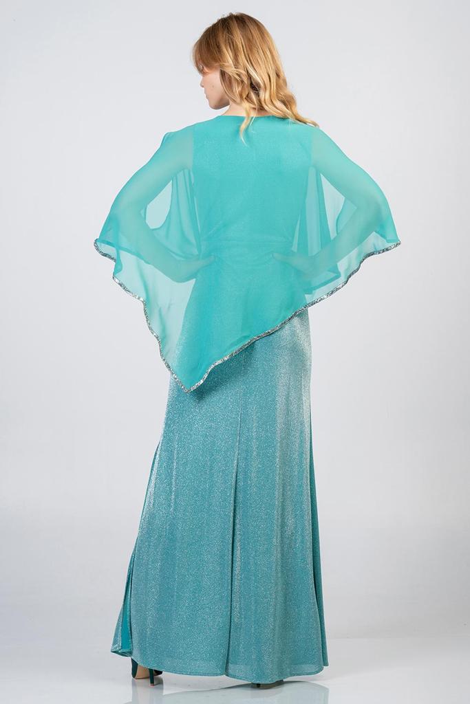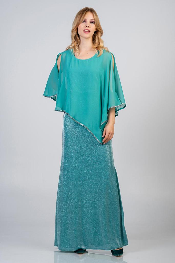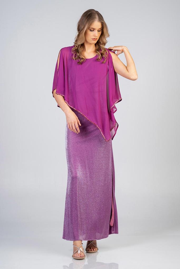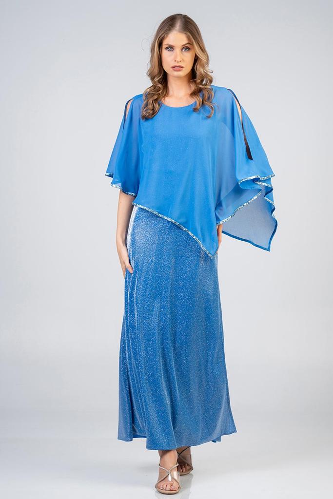 Maxi φόρεμα με γκλίτερ και τούλι. Το φόρεμα έχει γοργονέ εφαρμογή και από πάνω τούλι με άνοιγμα στους ώμους