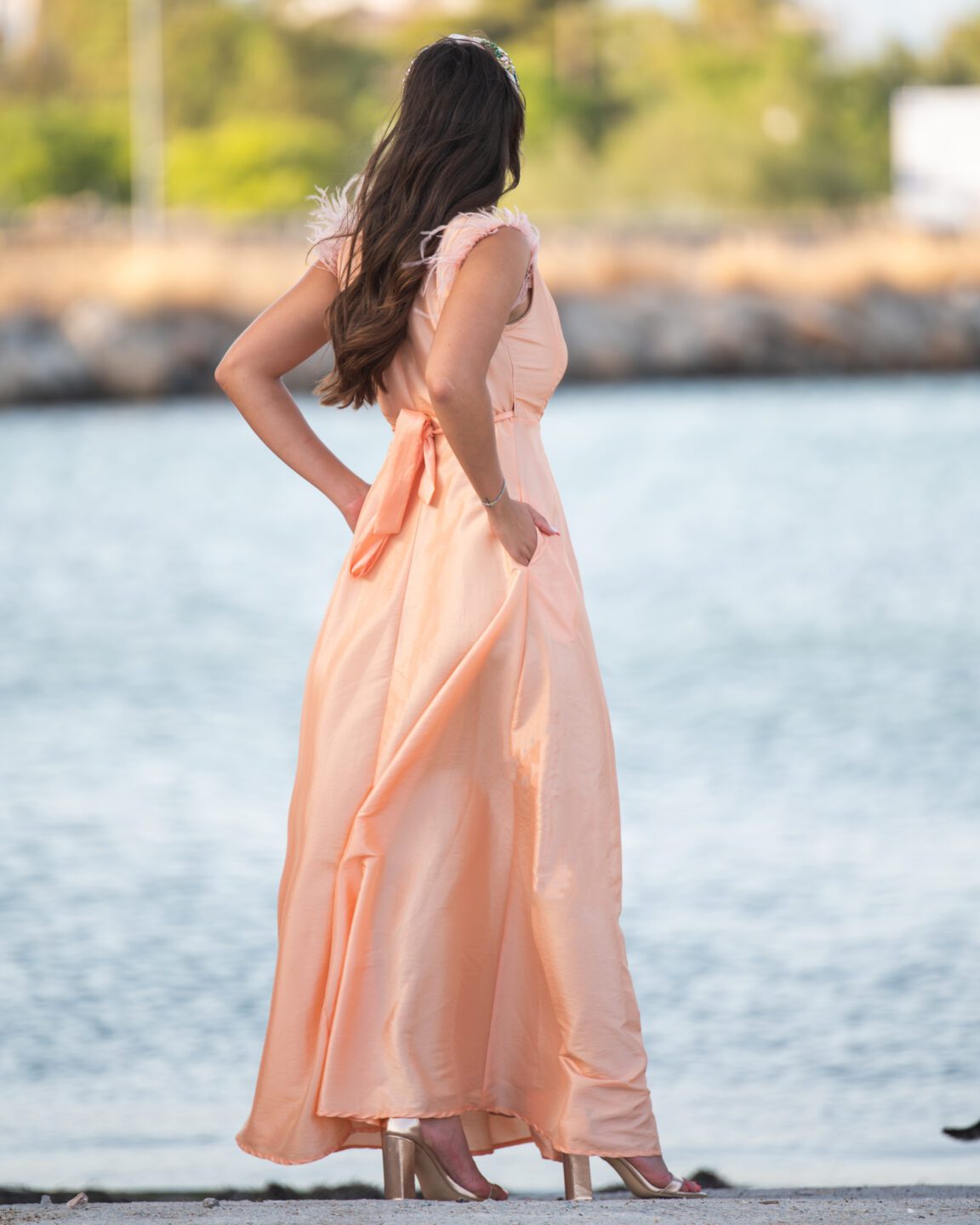 Maxi φόρεμα με φτερά σε μπεζ χρώμα. Έχει μεσάτη γραμμή και διαθέτει φτερά στα μανίκια. Κλείνει απο πίσω