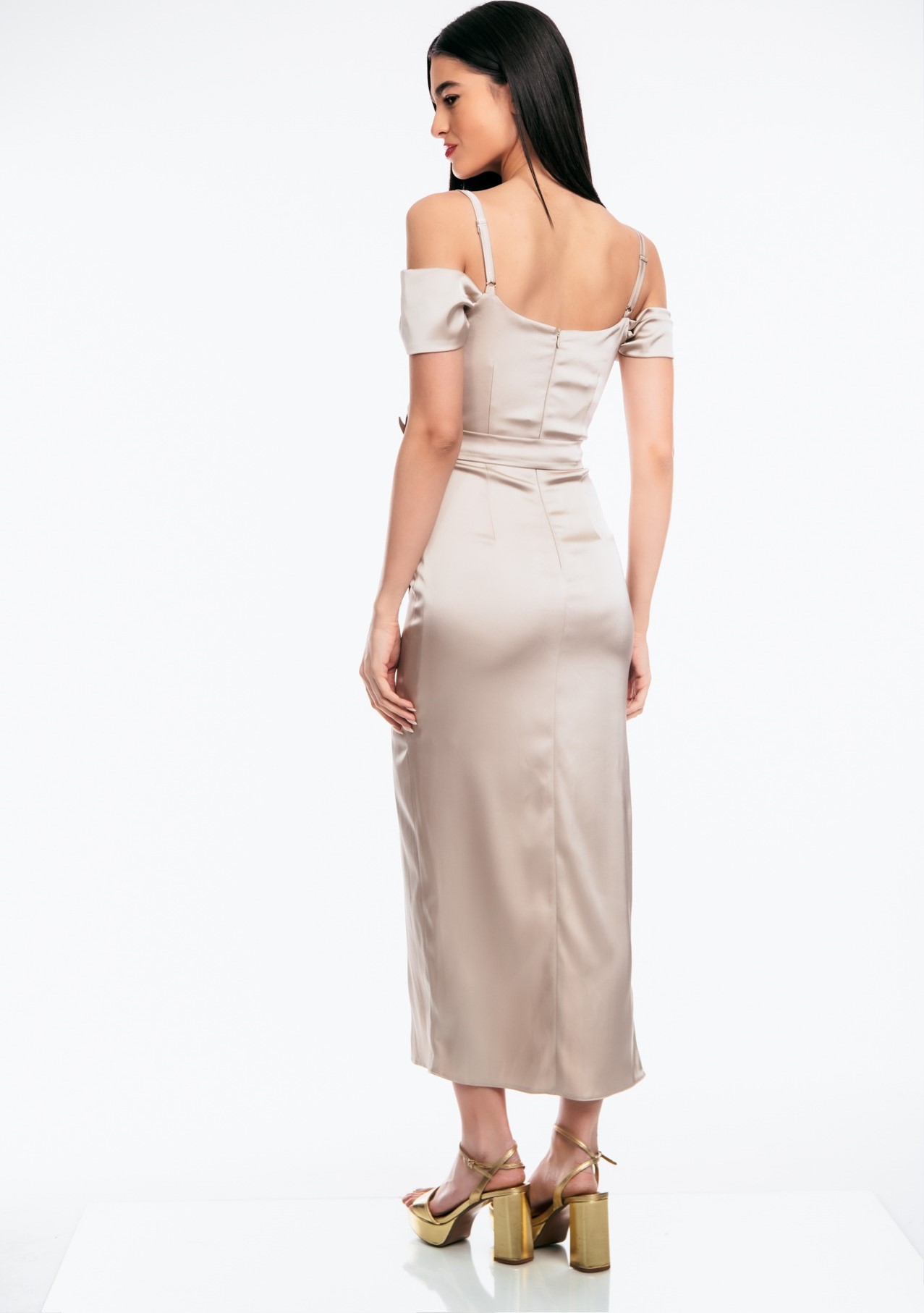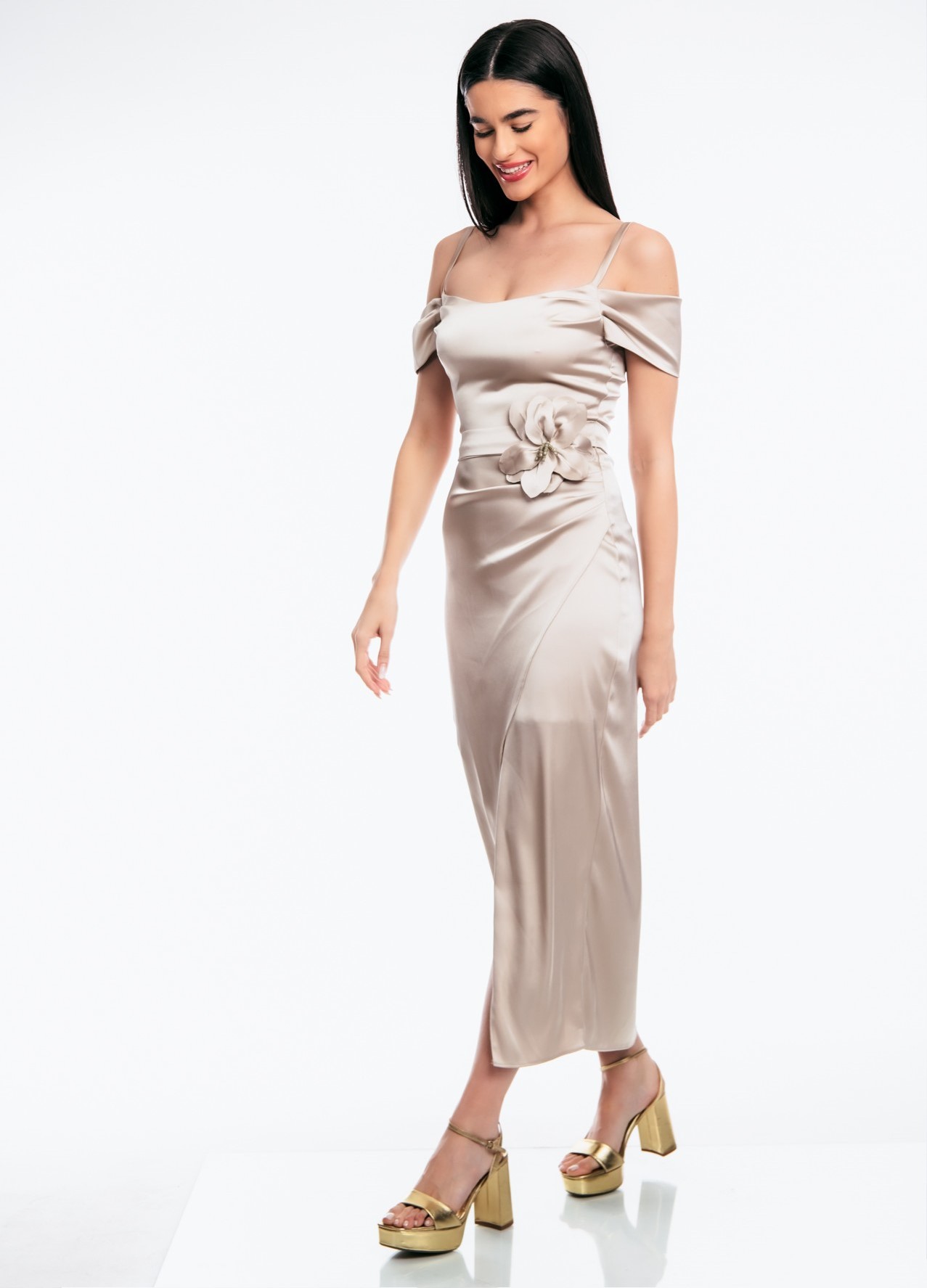 Maxi φόρεμα σατέν με λουλούδι στην μέση. Διαθέτει ραντάκι με μανικάκι να πέφτει στους ώμους. Έχει μεσάτη γραμμή και ένα λουλούδια στο πλάι