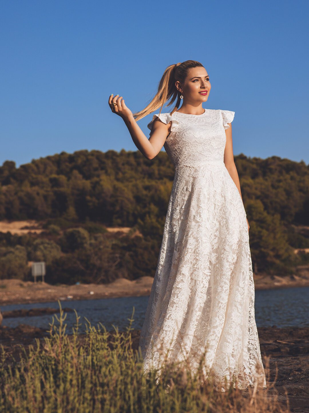 Εντυπωσιακό νυφικό σε άλφα γραμμή, με ολοκέντητη γαλλική δαντέλα και έξω πλάτη με δέσιμο. Κανονική εφαρμογή.