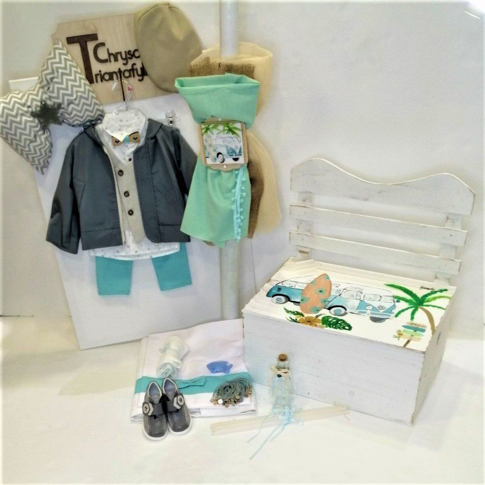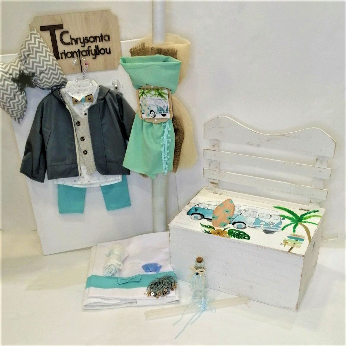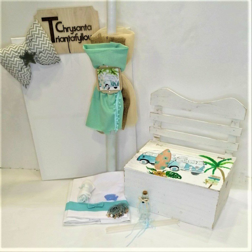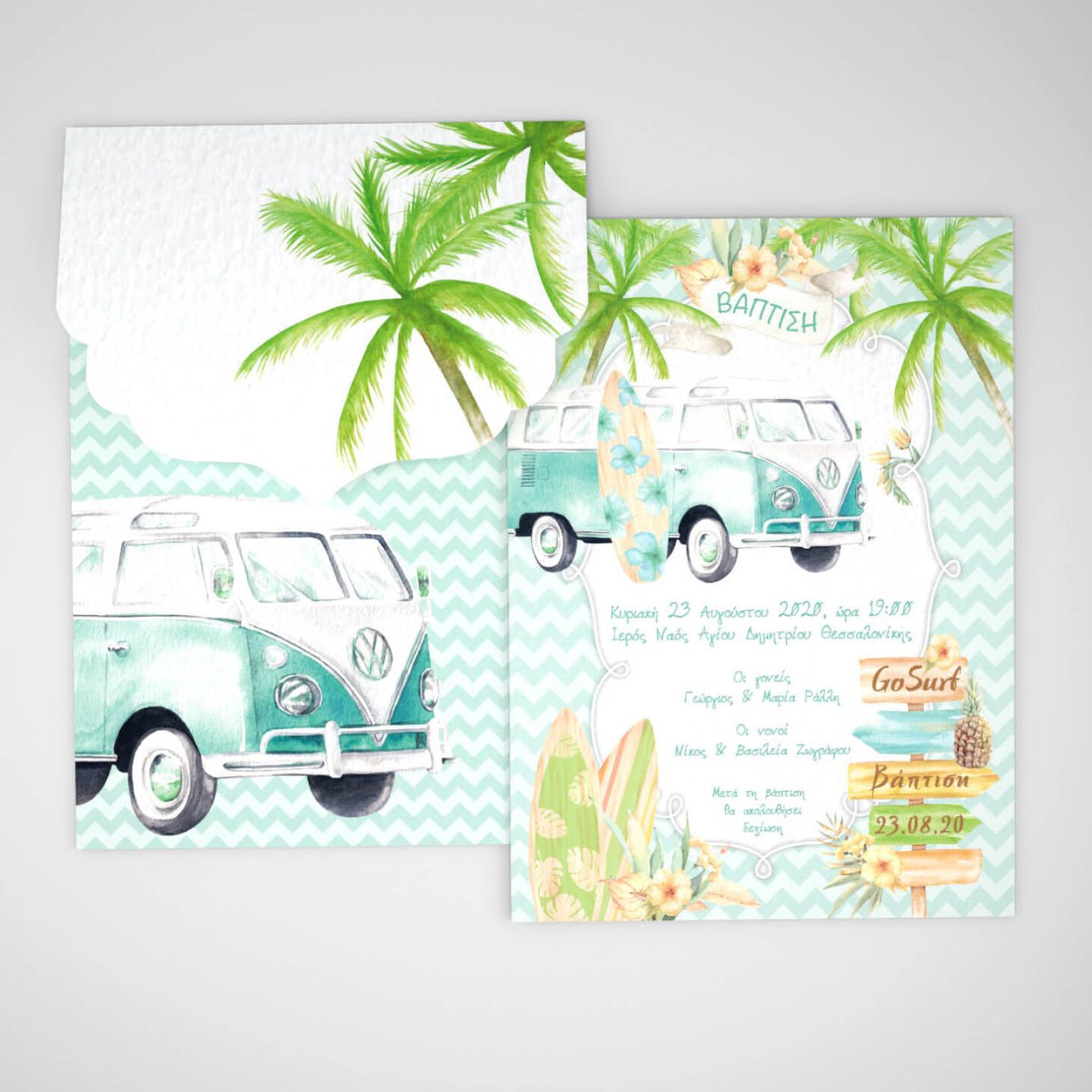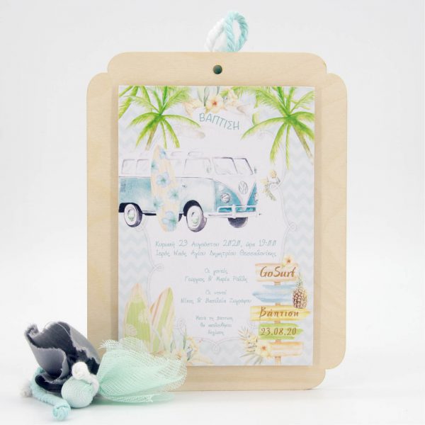 Επίλεξε για τη βάπτιση θέμα Vintage Van & Surfing. Πρόσθεσε αυτή τη μακέτα στο καλάθι σου, διάλεξε το είδος προσκλητηρίου εδώ, την μπομπονιέρα εδώ και το πλήρες σετ βάπτισης εδώ, βάλτα όλα μαζί στο καλάθι αγορών σου μαζί με αυτό το θέμα και εμείς θα εφαρμόσουμε το θέμα σου παντού!